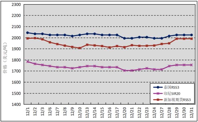 國(guó)外主產(chǎn)區(qū):12月,泰國(guó)RSS3平均價(jià)格為2020美元/噸,環(huán)比上漲54美元/噸,最高價(jià)為2045美元/噸,最低價(jià)為1995美元/噸;印尼SIR20平均價(jià)格為1738美元/噸,環(huán)比下跌7美元/噸,最高價(jià)為1785美元/噸,最低價(jià)為1705美元/噸;新加坡RSS3期貨主力合約月均結(jié)算價(jià)格為1946美元/噸,環(huán)比下跌4美元/噸,最高價(jià)為1997美元/噸,最低價(jià)為1907美元/噸。