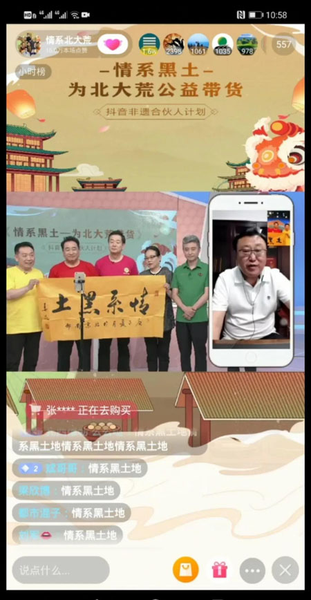 疫情暴發(fā)后,北大荒牽動著無數(shù)知青的心。為助力復(fù)工復(fù)產(chǎn)后北大荒企業(yè)發(fā)展,姜昆公益基金會發(fā)起了這場公益直播帶貨活動,并得到了央視、抖音官方、惠買集團、北京星合匯文化發(fā)展有限公司的大力支持。