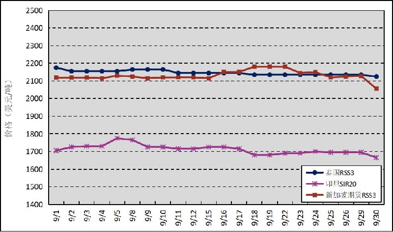 國外主產(chǎn)區(qū):9月,泰國RSS3平均價(jià)格為2146美元/噸,環(huán)比下跌40美元/噸,最高價(jià)為2175美元/噸,最低價(jià)為2125美元/噸;印尼SIR20平均價(jià)格為1712美元/噸,環(huán)比上漲30美元/噸,最高價(jià)為1775美元/噸,最低價(jià)為1665美元/噸;新加坡RSS3期貨主力合約月均結(jié)算價(jià)格為2131美元/噸,環(huán)比下跌36美元/噸,最高價(jià)為2181美元/噸,最低價(jià)為2056美元/噸。