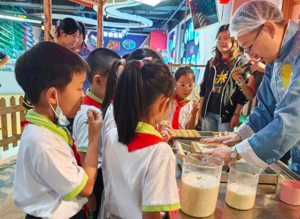在王致和科普館,學(xué)生們通過沉浸式體驗腐乳制作的全過程,深入了解傳統(tǒng)腐乳釀造的非遺技藝。通過開展科普研學(xué)活動,讓傳統(tǒng)工藝“傳”在孩子的手心里、留在孩子的記憶中。始創(chuàng)于清康熙八年(1669年)的王致和,距今已有350余年歷史?!拔覀兊拿恳粔K腐乳,都要經(jīng)35道工序、歷百天醞釀變化才能來到消費者手里。我們的研發(fā)和創(chuàng)新,都是在嚴(yán)守傳統(tǒng)工藝和流程的前提下進行的優(yōu)化和提升。”王致和公司副總經(jīng)理楊凱介紹,作為國內(nèi)最大的腐乳生產(chǎn)企業(yè),王致和將300余年的腐乳釀造技藝與現(xiàn)代科技深度交融,通過現(xiàn)代工藝使得每一道加工工序都擺脫了“少量、差不多”的經(jīng)驗性操作模式,不再單憑感官判定,工藝參數(shù)均得到了量化和標(biāo)準(zhǔn)化,有效地保證了產(chǎn)品品質(zhì)的穩(wěn)定性。